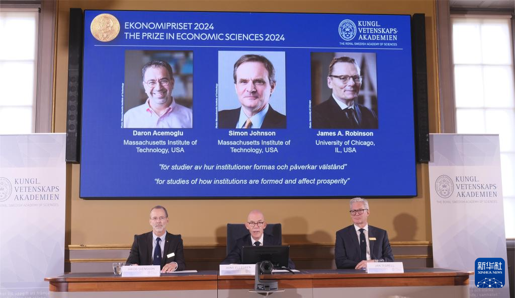 新华社斯德哥尔摩10月14日电(记者张玉亮 陈静)瑞典皇家科学院14日在斯德哥尔摩宣布,将2024年诺贝尔经济学奖授予三位来自美国大学的经济学家达龙·阿杰姆奥卢、西蒙·约翰逊和詹姆斯·鲁滨逊,以表彰他们在关于制度如何形成并影响经济繁荣研究领域的突出贡献。