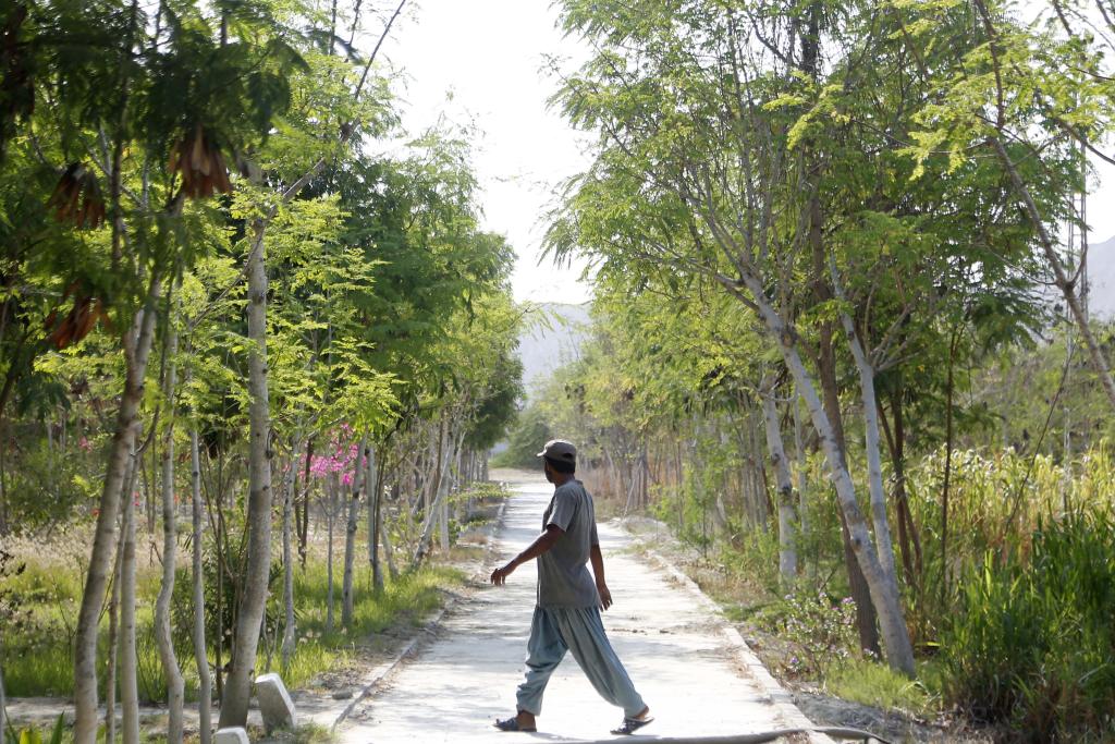 在巴基斯坦瓜达尔,一名园丁走在中巴友谊林内(9月15日摄)。