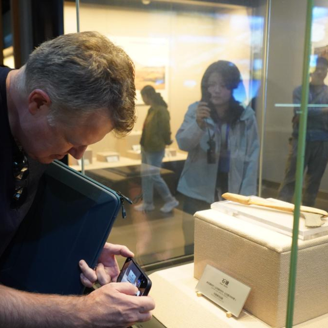 10月15日,巴西《圣保罗页报》首席商务官马塞洛·索萨·利马·贝内斯在新疆吐鲁番博物馆用手机拍摄展品。新华社记者 朱艺琳 摄