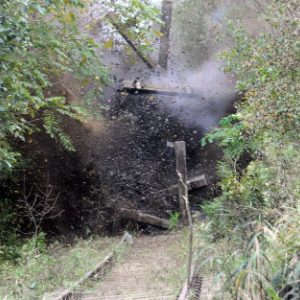 这张朝中社提供的照片显示的是,朝方以爆破方式封闭铁路。