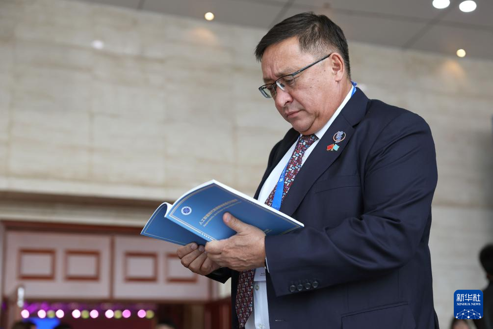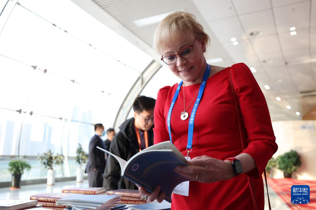 10月14日,参会代表在第六届世界媒体峰会开幕式会场翻阅《人工智能时代新闻媒体的责任与使命》智库报告。