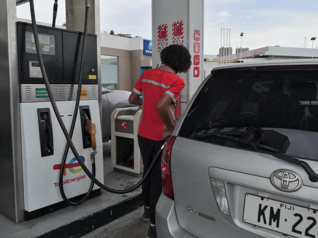 2022年3月17日,一名女子在斐济首都苏瓦的一家加油站加油(手机拍摄)。新华社记者张永兴摄