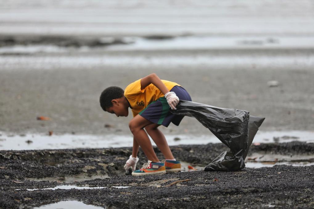 2023年6月7日,一名小学生在斐济首都苏瓦清理海滩垃圾。新华社发(桑钦龙摄)