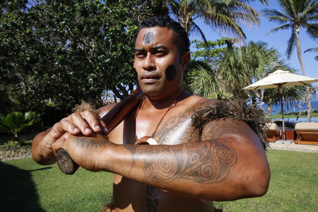 2020年7月21日,在斐济首都苏瓦附近的纳努库奥博格海边度假村,一名斐济“武士”迎接游客。新华社记者张永兴摄