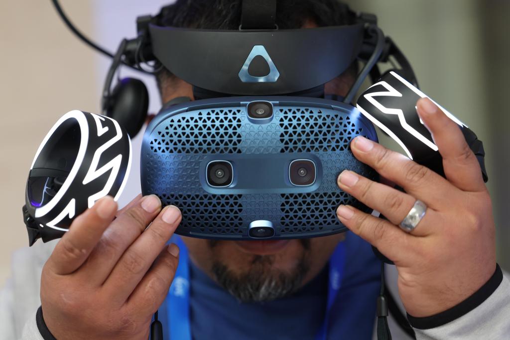 10月15日,与会嘉宾代表在国能集团龙源吐鲁番新能源有限公司参访时体验虚拟现实技术。