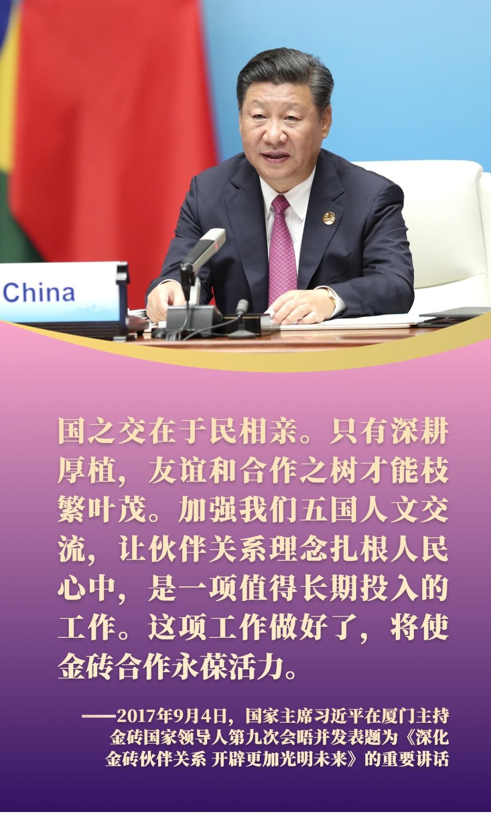 国之交在于民相亲,民相亲在于心相通。在中国的积极参与和全力推动下,金砖合作从政治、经济“双轮驱动”升级为政治安全、经贸财金和人文交流“三轮驱动”的架构。习近平主席多次倡导金砖国家用好各种机制,深化人文交流,增进民心相通。