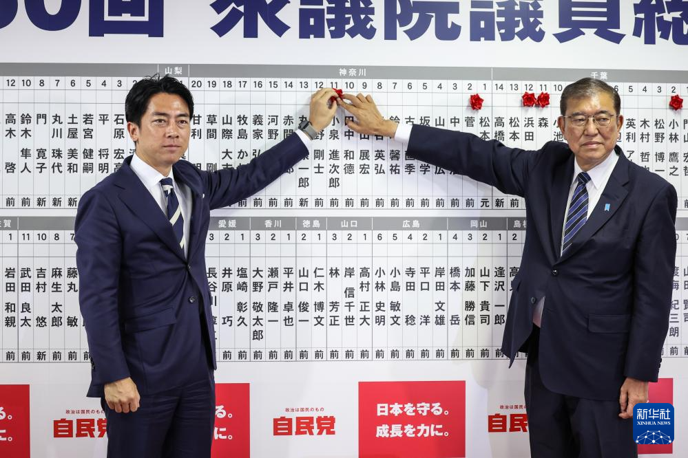 10月27日,在日本东京自民党总部,日本首相、自民党总裁石破茂(右)和前环境大臣小泉进次郎将象征成功当选的红花贴在候选人名字上。新华社发(Pool图片,青山隆史摄)