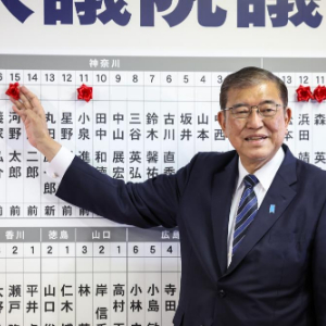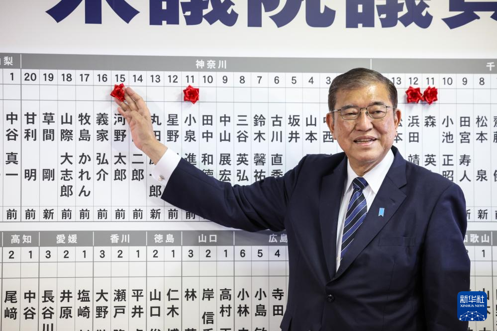 10月27日,在日本东京自民党总部,日本首相、自民党总裁石破茂将象征成功当选的红花贴在候选人名字上。新华社发(Pool图片,青山隆史摄)