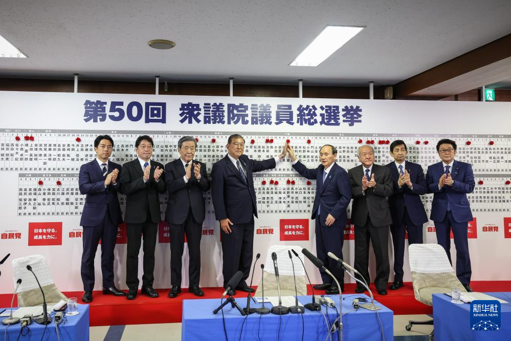 10月27日,在日本东京自民党总部,日本首相、自民党总裁石破茂(左四)和其他自民党成员一同将象征成功当选的红花贴在候选人名字上。新华社发(Pool图片,青山隆史摄)