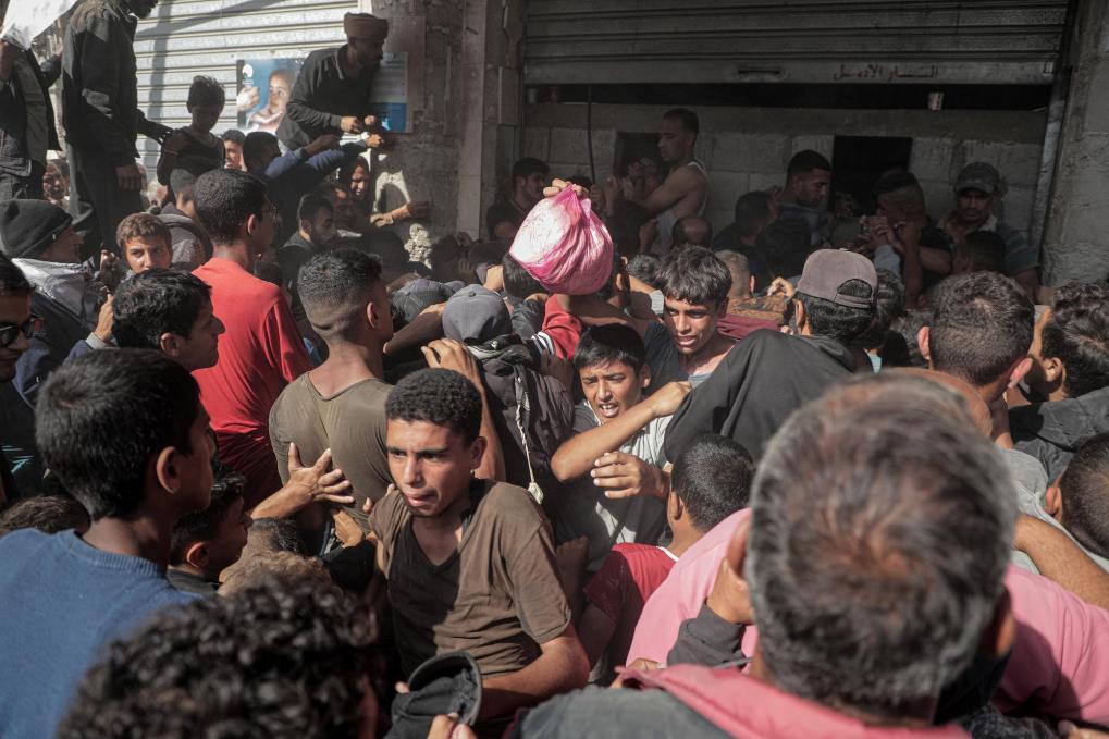 10月23日,人们在加沙地带北部的加沙城领取救济食品。新华社发(马哈茂德·扎基摄)