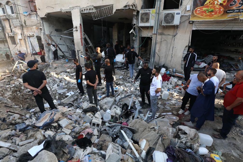 10月4日,在约旦河西岸北部图勒凯尔姆难民营,当地民众查看以军空袭后的废墟。新华社发(尼达尔·艾仕塔耶摄)