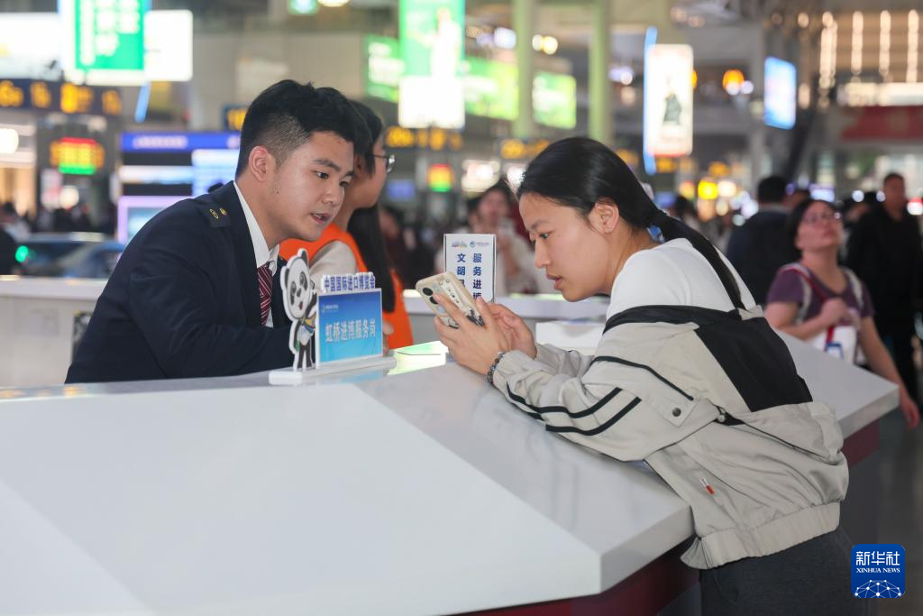 11月3日,工作人员在上海虹桥火车站服务台解答旅客问询。