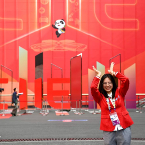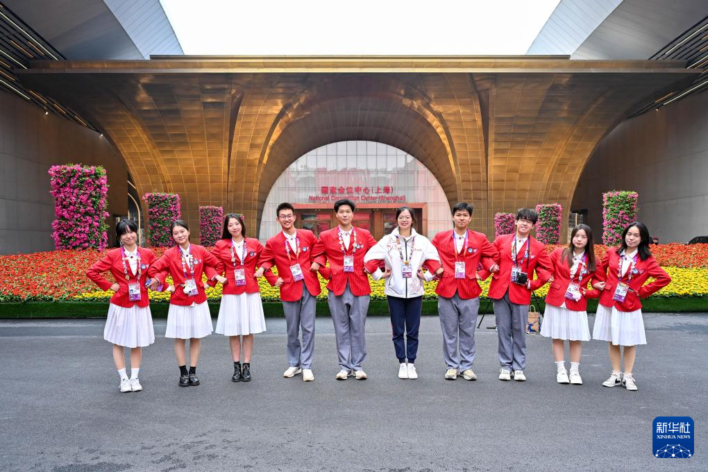 11月4日,志愿者在第七届中国国际进口博览会举办场地——国家会展中心(上海)留影。