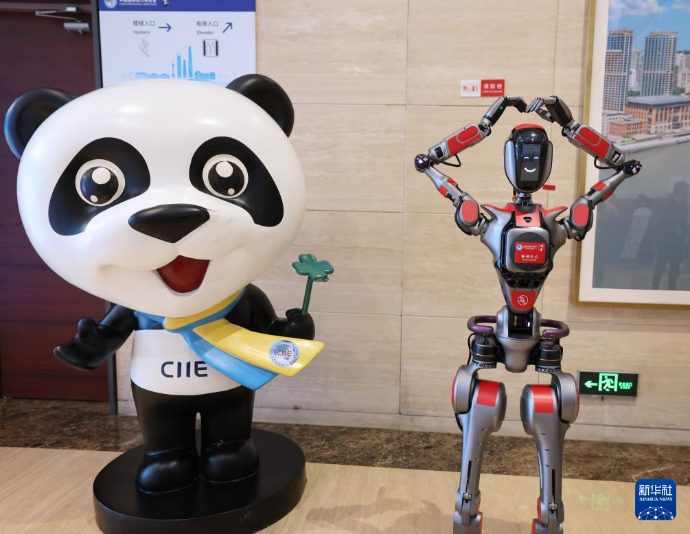 11月4日,中国国际进口博览会吉祥物“进宝”和新闻中心的机器人“小新”在欢迎记者。