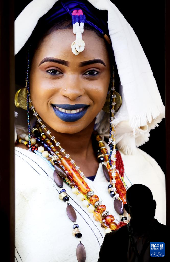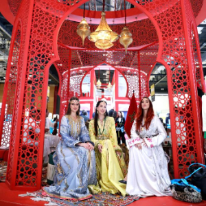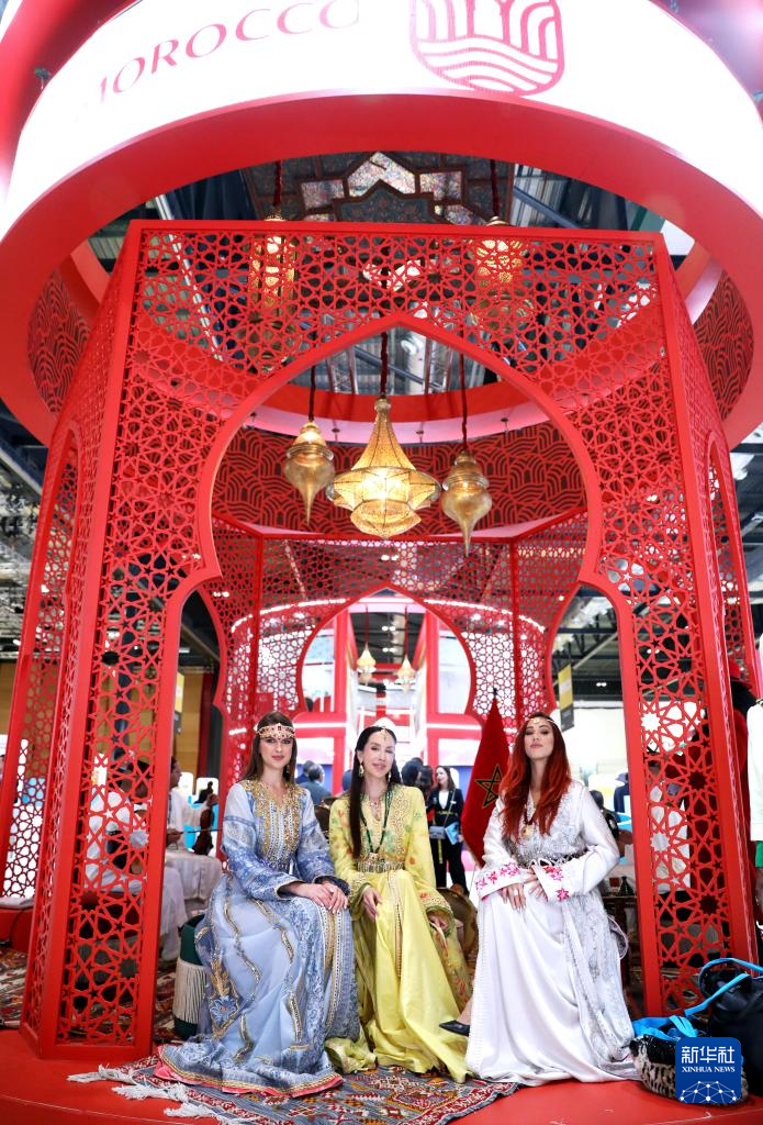 11月5日,模特在2024年英国伦敦世界旅游交易会摩洛哥展区合影。