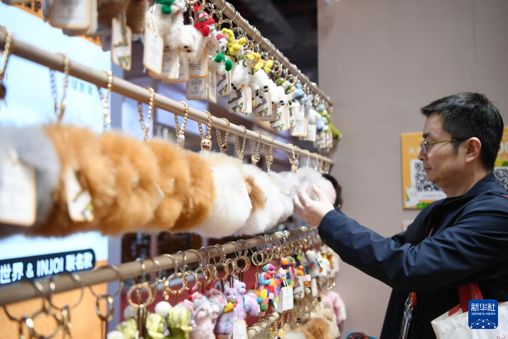 11月5日,人们在上海的第七届进博会秘鲁“温暖驼”展台选购羊驼玩偶。