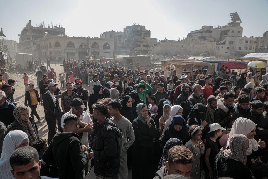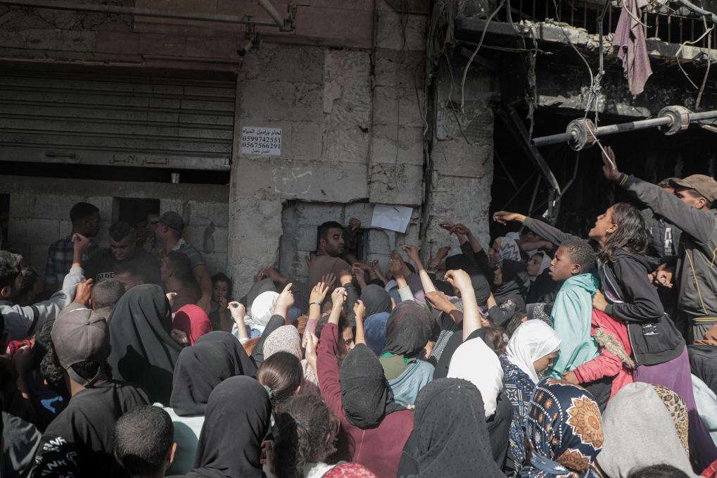10月23日,人们在加沙地带南部城市汗尤尼斯唯一还在营业的大饼店购买大饼。新华社发(里泽克·阿卜杜勒贾瓦德摄)
