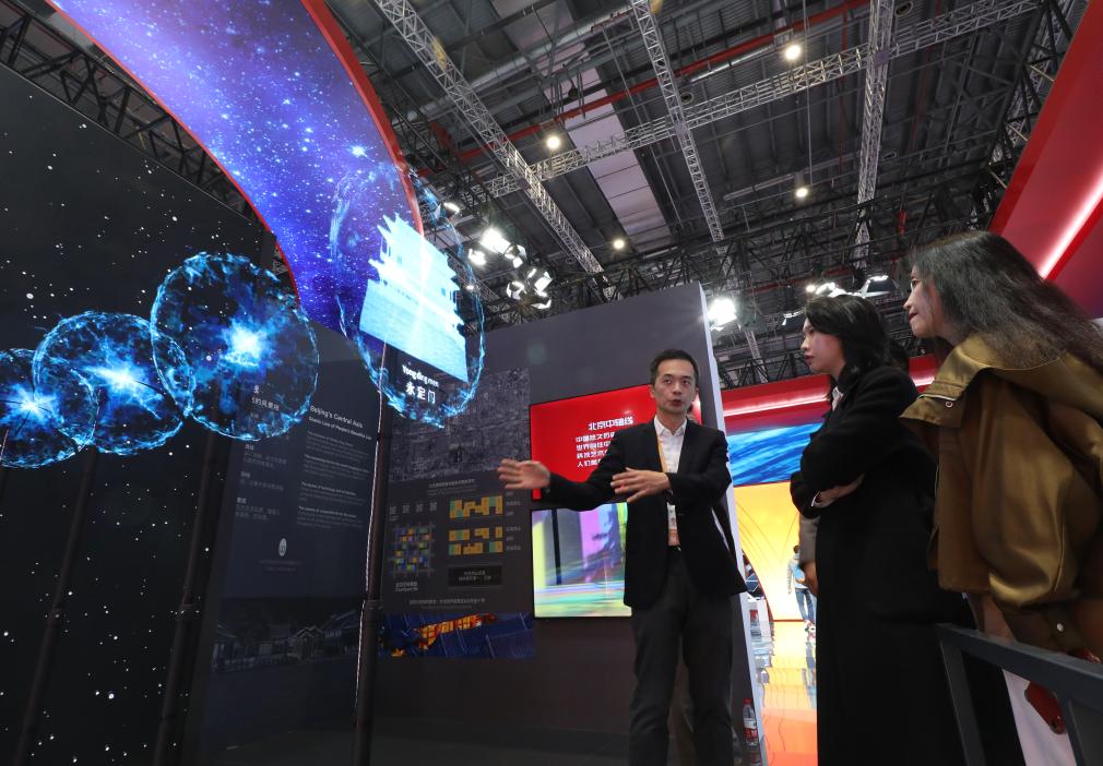 11月7日,观众在第七届进博会国家展中国馆内观看北京中轴线的全息3D智能炫屏展示。新华社记者方喆摄
