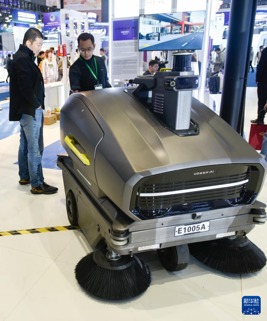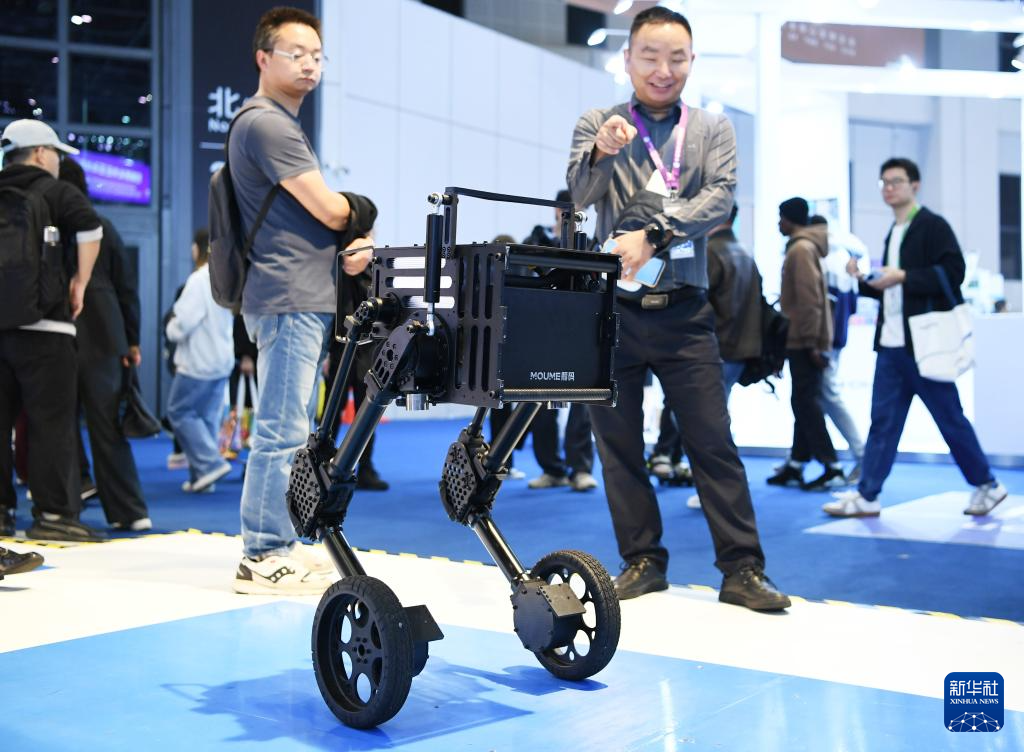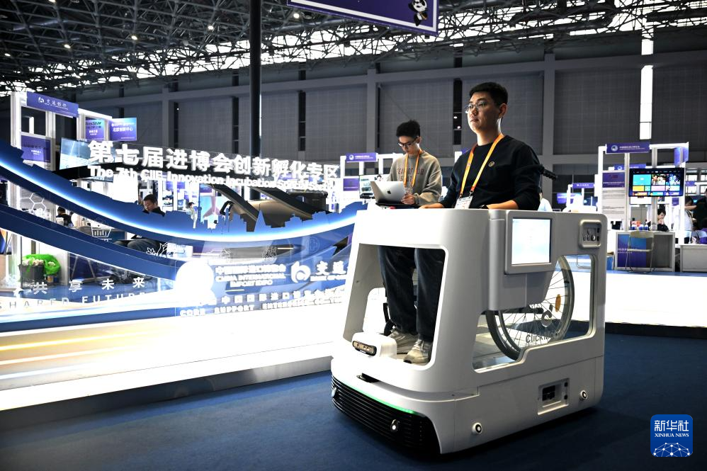 11月9日,在第七届进博会创新孵化专区,参观者查看一款双轮足机器人。