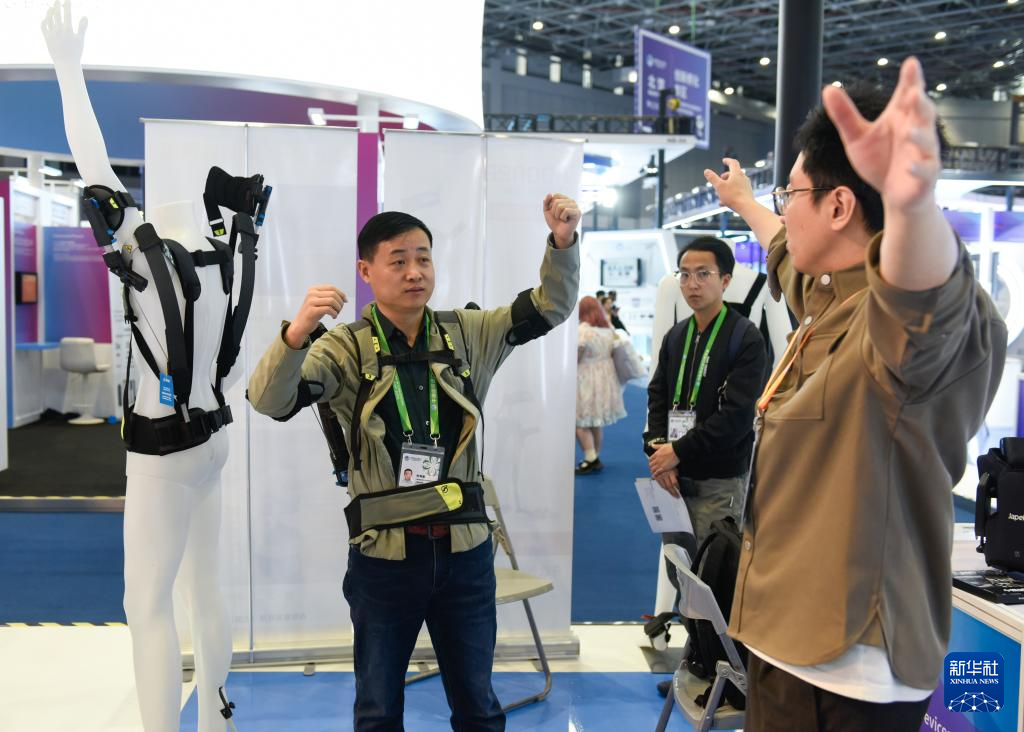 11月9日,观众在第七届进博会创新孵化专区体验一款外骨骼产品。