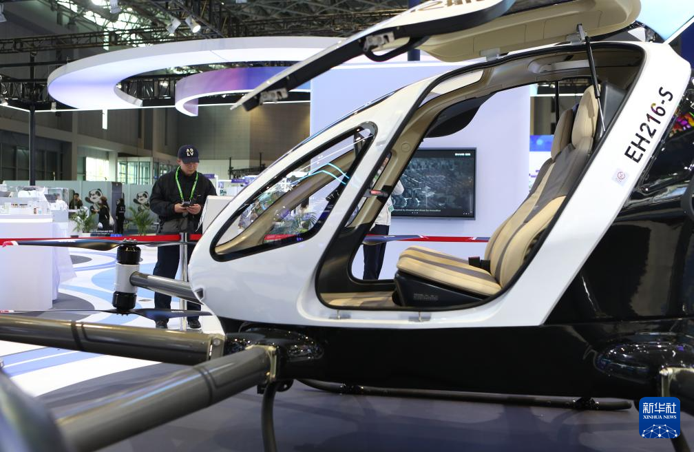 11月9日,参观者在第七届进博会创新孵化专区了解无人驾驶载人电动垂直起降航空器。