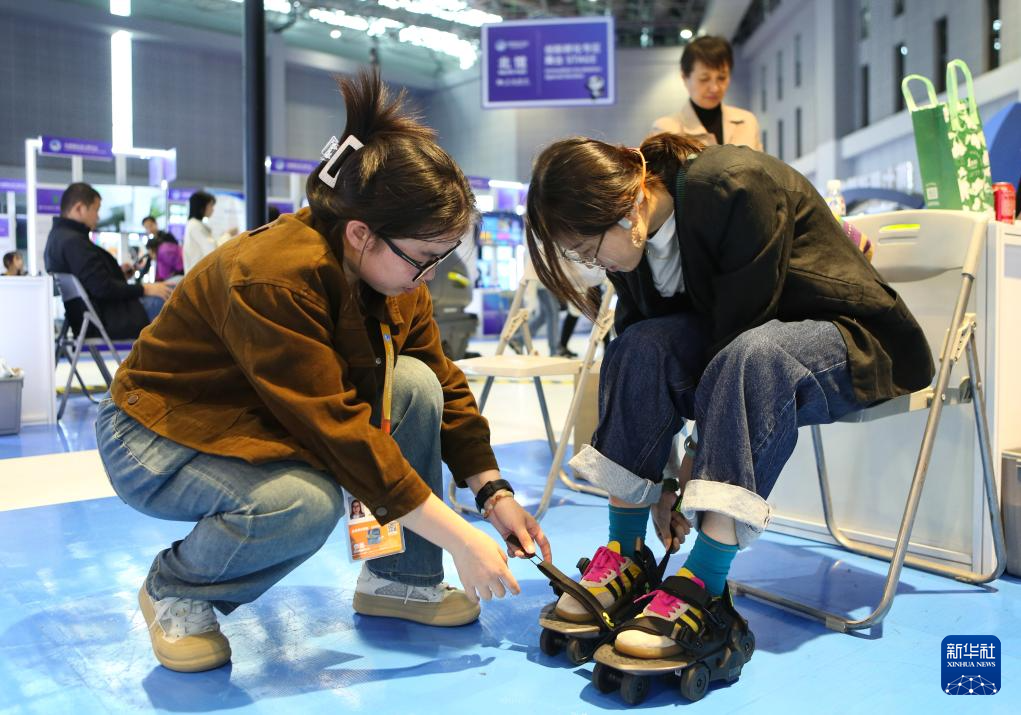 11月9日,在第七届进博会创新孵化专区,参展商帮助参观者试穿智能动力鞋。