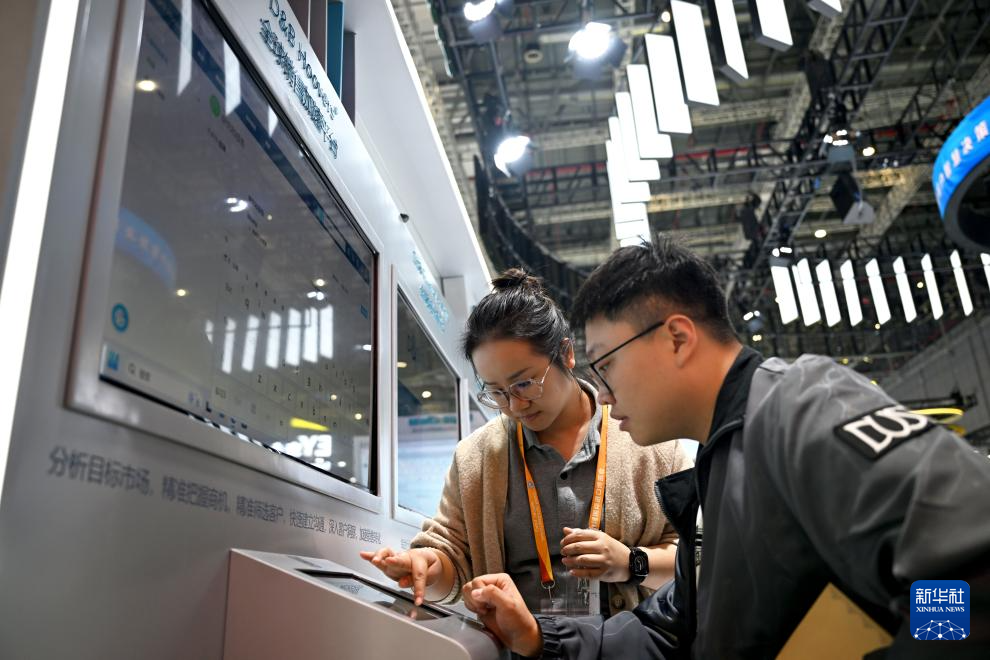 11月9日,在第七届进博会服务贸易展区,邓白氏公司的工作人员(左)向观众介绍“全球销售加速平台”解决方案。