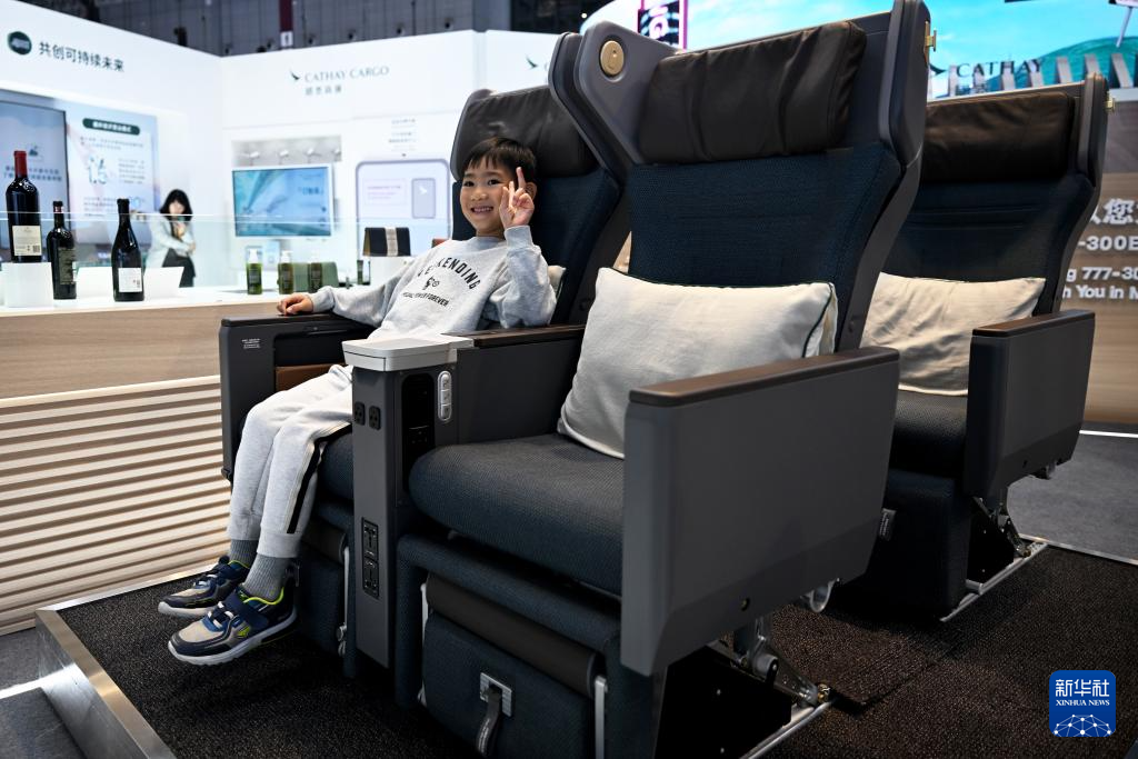 11月9日,在第七届进博会服务贸易展区,小朋友在体验改良过的经济舱座椅。
