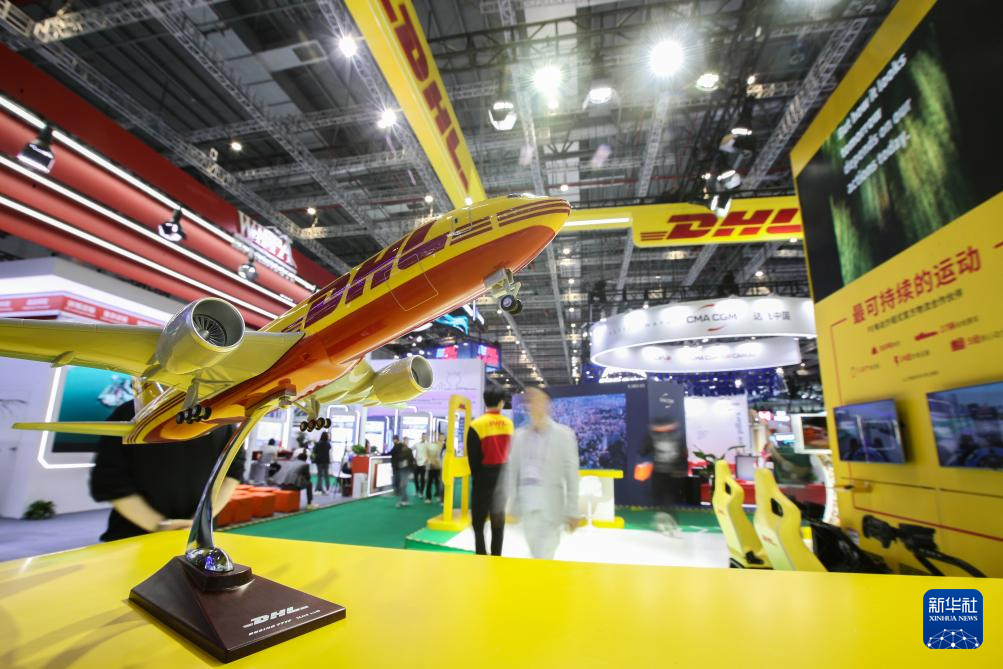 这是11月9日在第七届进博会服务贸易展区拍摄的DHL展台。