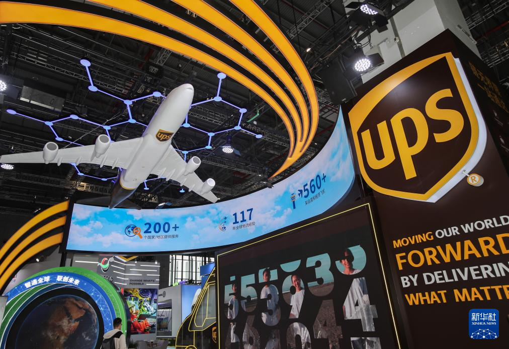 这是11月9日在第七届进博会服务贸易展区拍摄的UPS展台。