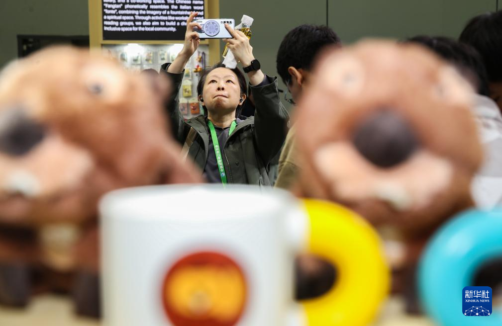 11月9日,一名观众在第七届进博会服务贸易展区拍摄文创产品。