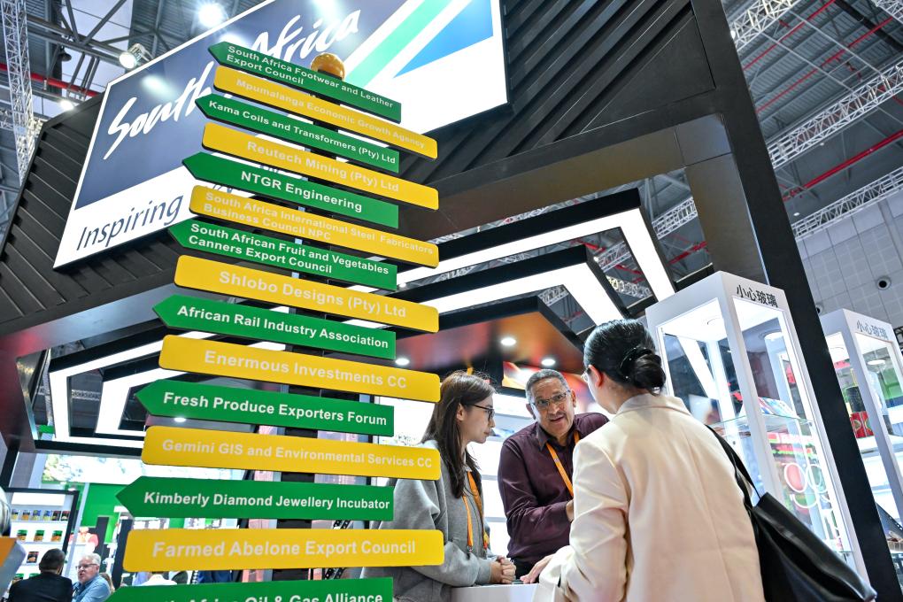 11月7日,一名观众(右一)在第七届进博会国家展南非馆咨询。新华社记者 张铖 摄