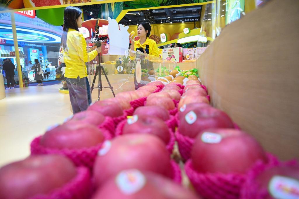 11月6日,参展商在第七届进博会食品及农产品展区通过在线直播介绍水果产品。新华社记者张可任摄