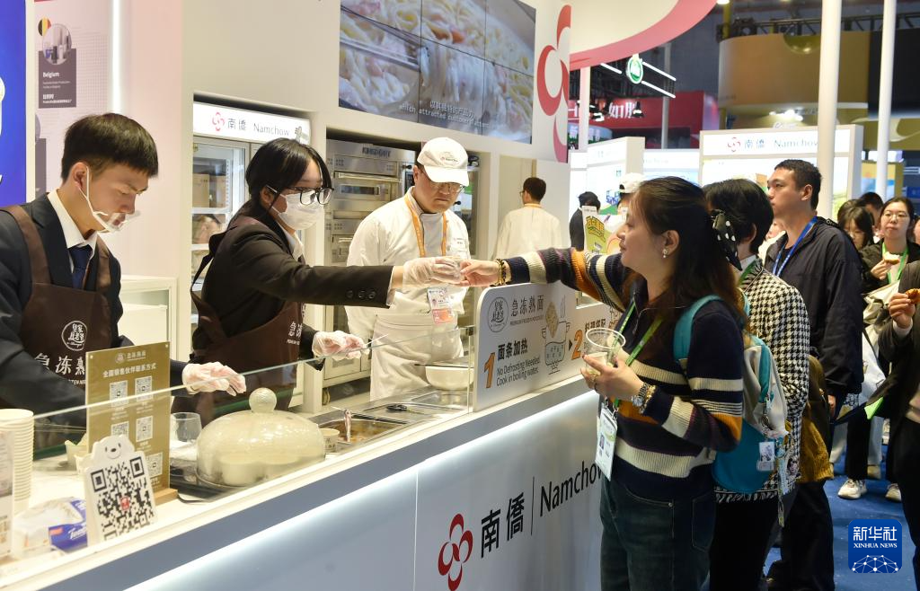 11月10日,参观者在第七届进博会食品及农产品展区品尝美食。