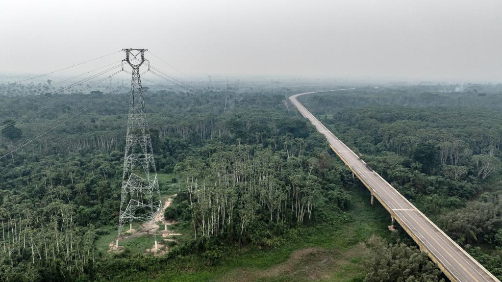这张9月13日拍摄的照片显示,在巴西朗多尼亚州,EDP输变电项目线路穿越热带雨林(无人机照片)。巴西EDP输变电项目是位于巴西北部的阿克里州和朗多尼亚州的绿地输变电工程,山东电建一公司承担了该项目的EPC总承包任务。新华社记者王天聪摄