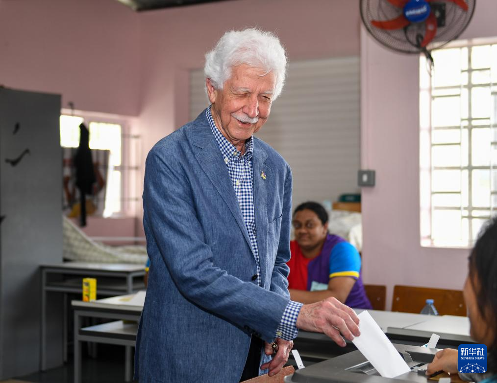11月10日,前总理保罗·雷蒙·贝朗热(左)在毛里求斯瓦科阿市的一处投票站投票。新华社记者 李亚辉 摄
