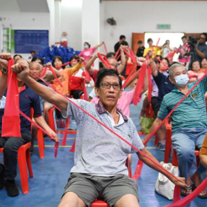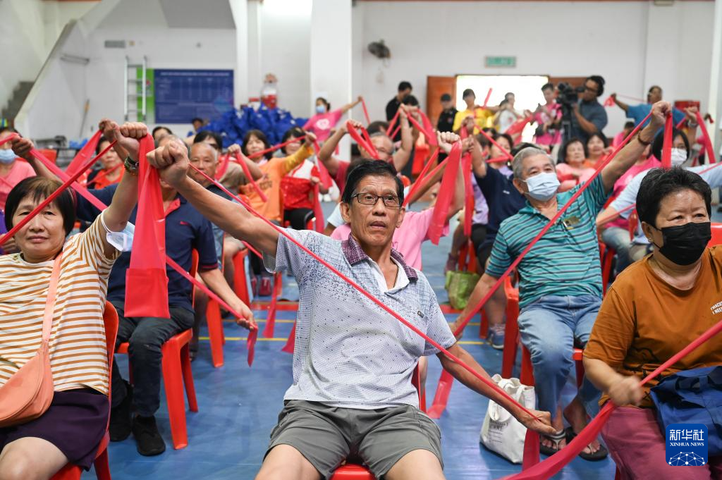 11月9日,在马来西亚雪兰莪州蒲种再也,当地民众在义诊活动现场使用弹力带进行上肢力量锻炼。新华社发(李潇然摄)