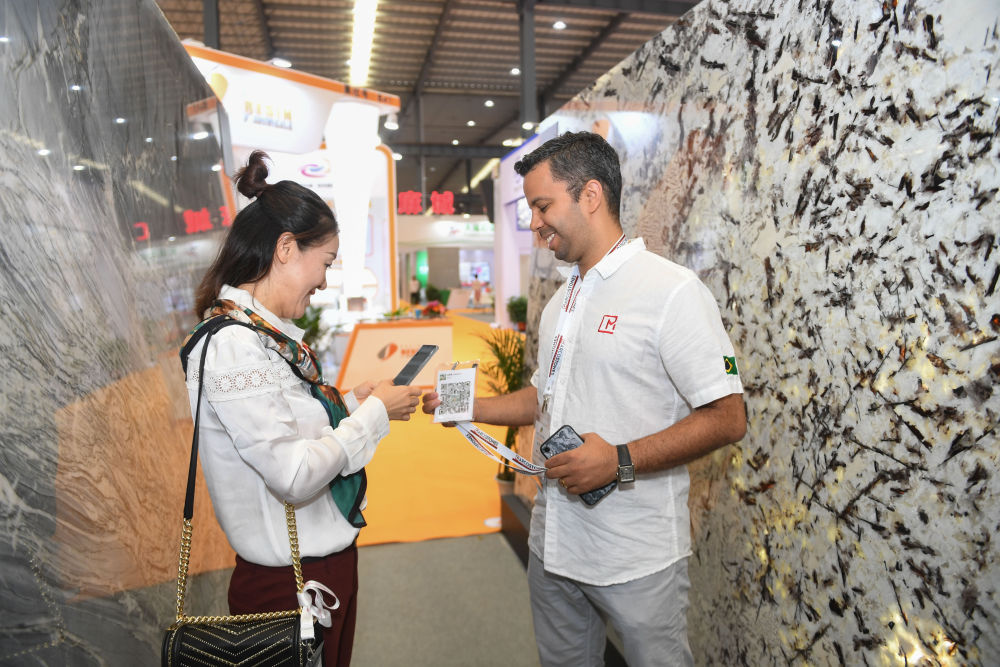 2019年11月8日,巴西商人马库斯在福建省南安市水头镇举办的国际石材博览会上向国内客商出示自己的微信二维码。