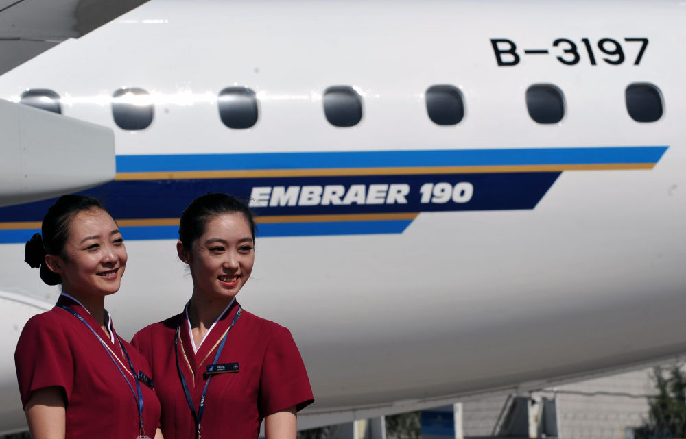 2011年8月16日,巴西航空工业公司生产的EMB190喷气式飞机抵达乌鲁木齐国际机场,正式加入南航新疆分公司机队。这是南航空乘人员在飞机前合影。