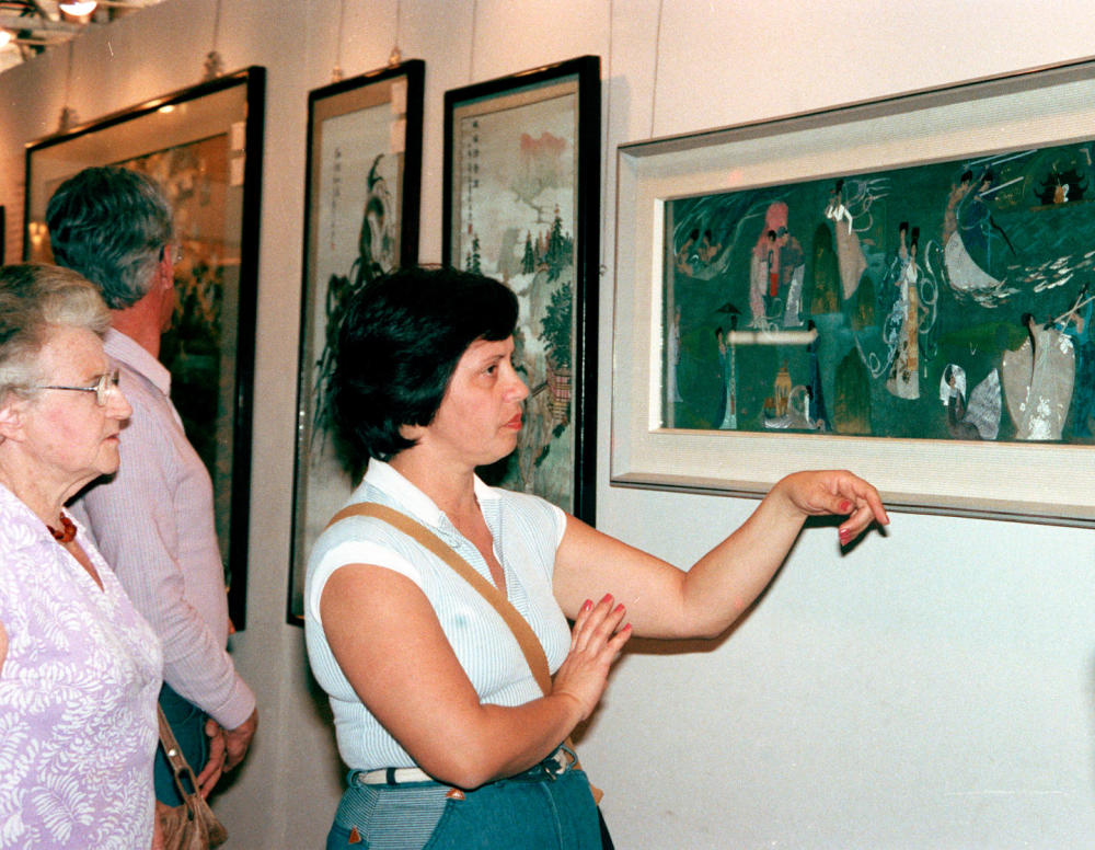 1983年5月24日至7月31日,中国经济贸易展览会在巴西圣保罗和里约热内卢举办。这是巴西观众在展览会上欣赏贝雕羽毛画。