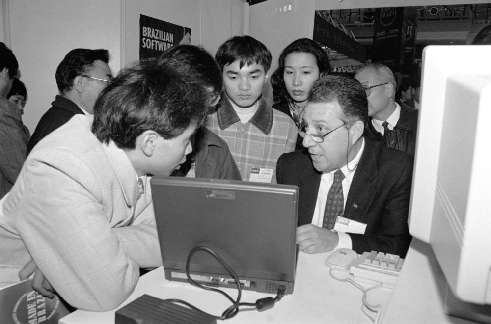 1995年12月14日,巴西外贸及合资项目洽谈会在上海举行。这是一位参展商向参观者介绍巴西电脑网络系统软件设备。