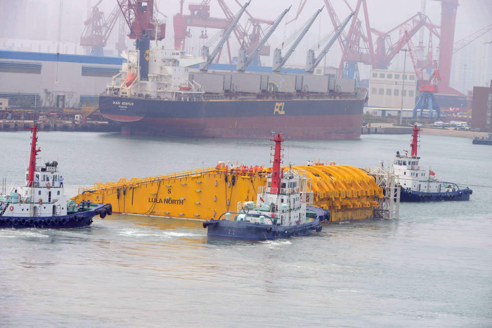 2013年7月15日,出口巴西的深海石油开采浮体在拖船牵引下离开山东青岛港码头。这套浮体服务于巴西近海300公里桑托斯盆地的深海油田。