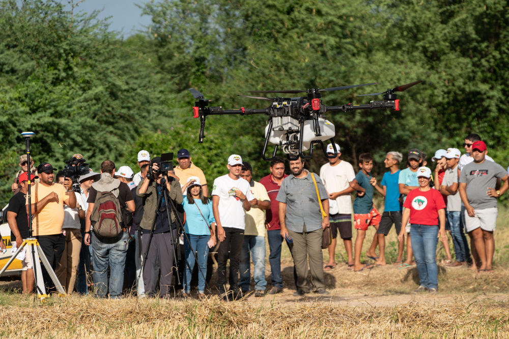 2024年2月2日,中巴农业机械化合作示范项目启动仪式在巴西阿波迪举行,第一批来自中国7家农机企业共31台(件)设备正式交付给巴西农村劳动者组织。这是人们观看一款中国生产的农用无人机。