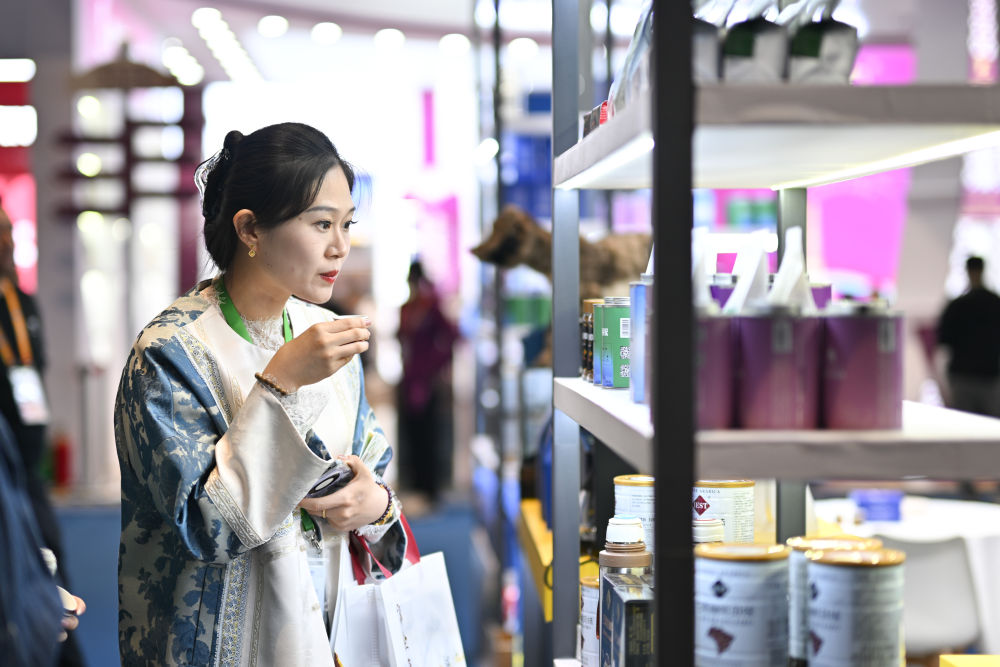 2024年11月6日,参会人员在上海举行的第七届进博会食品及农产品展区品尝来自巴西的咖啡。