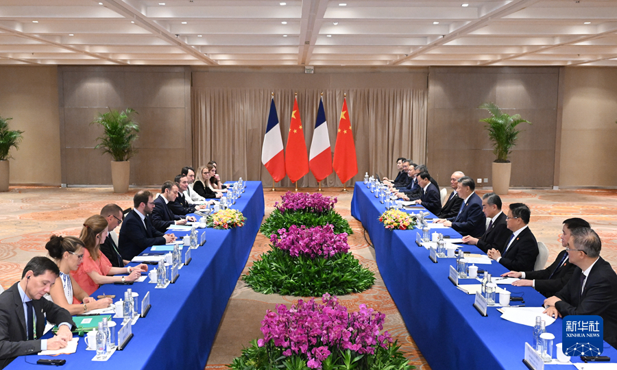 当地时间11月19日上午,国家主席习近平在里约热内卢出席二十国集团领导人峰会期间会见法国总统马克龙。