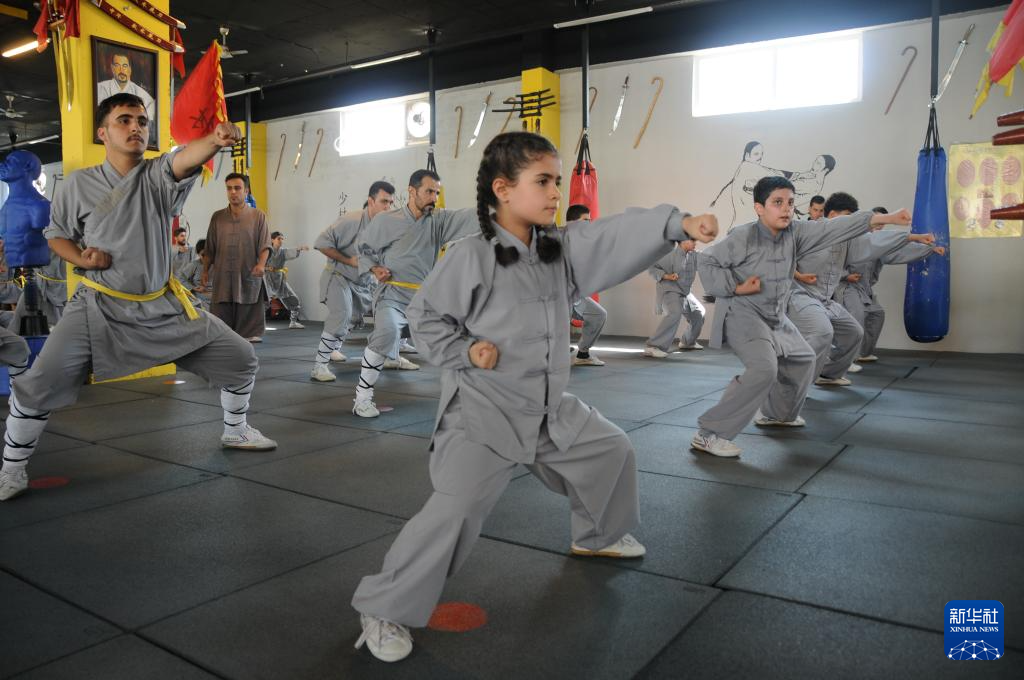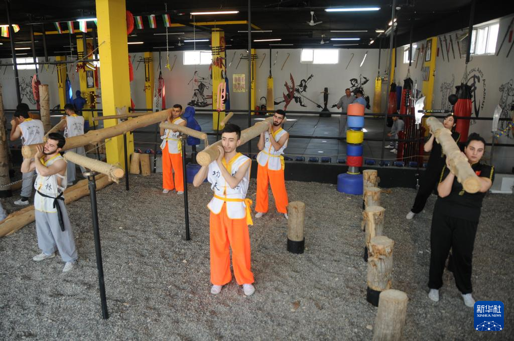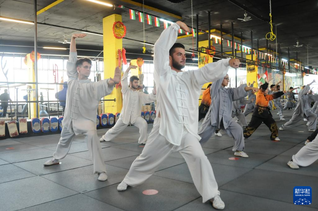 在伊拉克北部库尔德自治区(库区)苏莱曼尼亚市的一间武馆内,100余名当地武术爱好者身着中国传统练功服正在练习武术套路,一招一式干净利落,“嘿哈”之声铿锵有力。