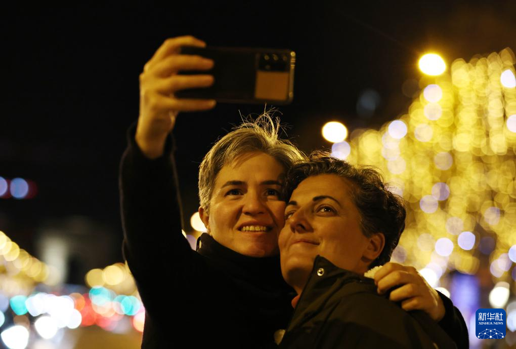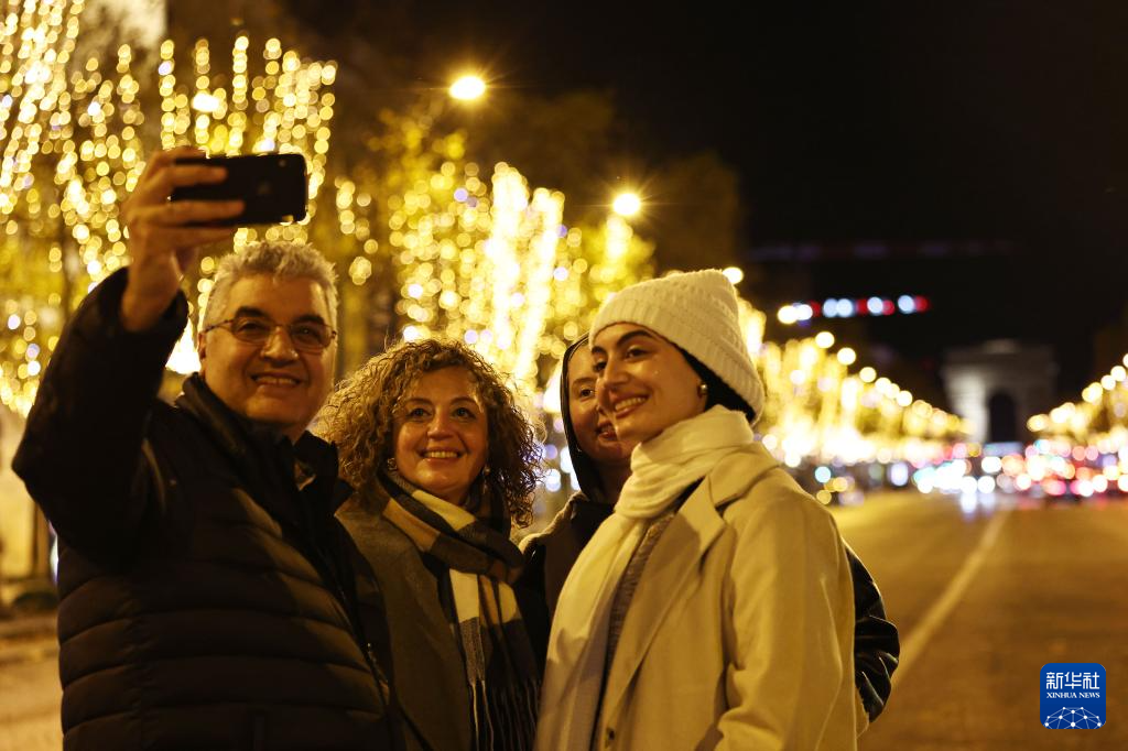 11月24日,人们在法国巴黎点灯后的香榭丽舍大街上拍照留念。