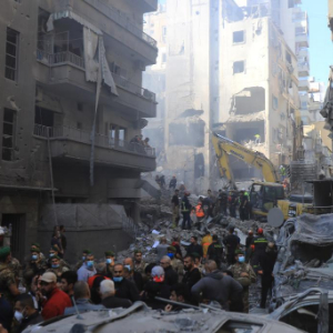 11月23日,在黎巴嫩贝鲁特,人们在遭以军空袭的建筑废墟参与搜救。新华社发