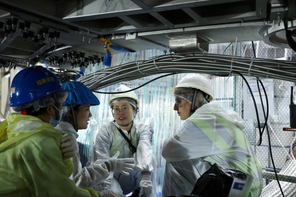 11月22日,在广东江门开平市,中国科学院高能物理研究所特聘青年研究员赵洁(左二)和意大利专家莫妮卡(右一)等讨论中微子实验探测器有机玻璃球的清洗进展。(新华社记者金立旺摄)