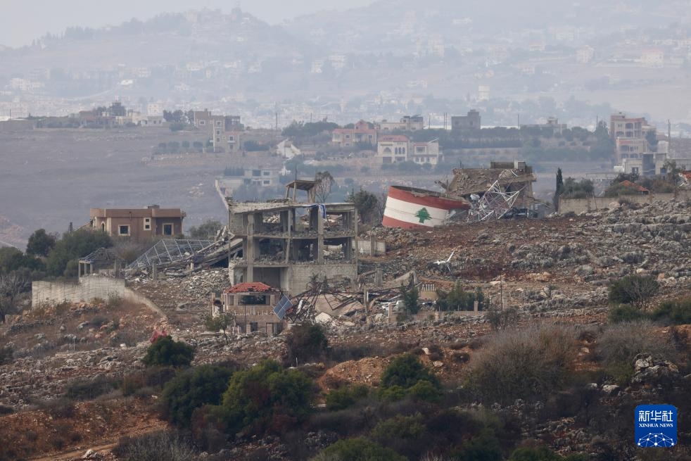 这是11月27日从黎巴嫩和以色列边境地区以色列一侧拍摄的黎南部损毁建筑。